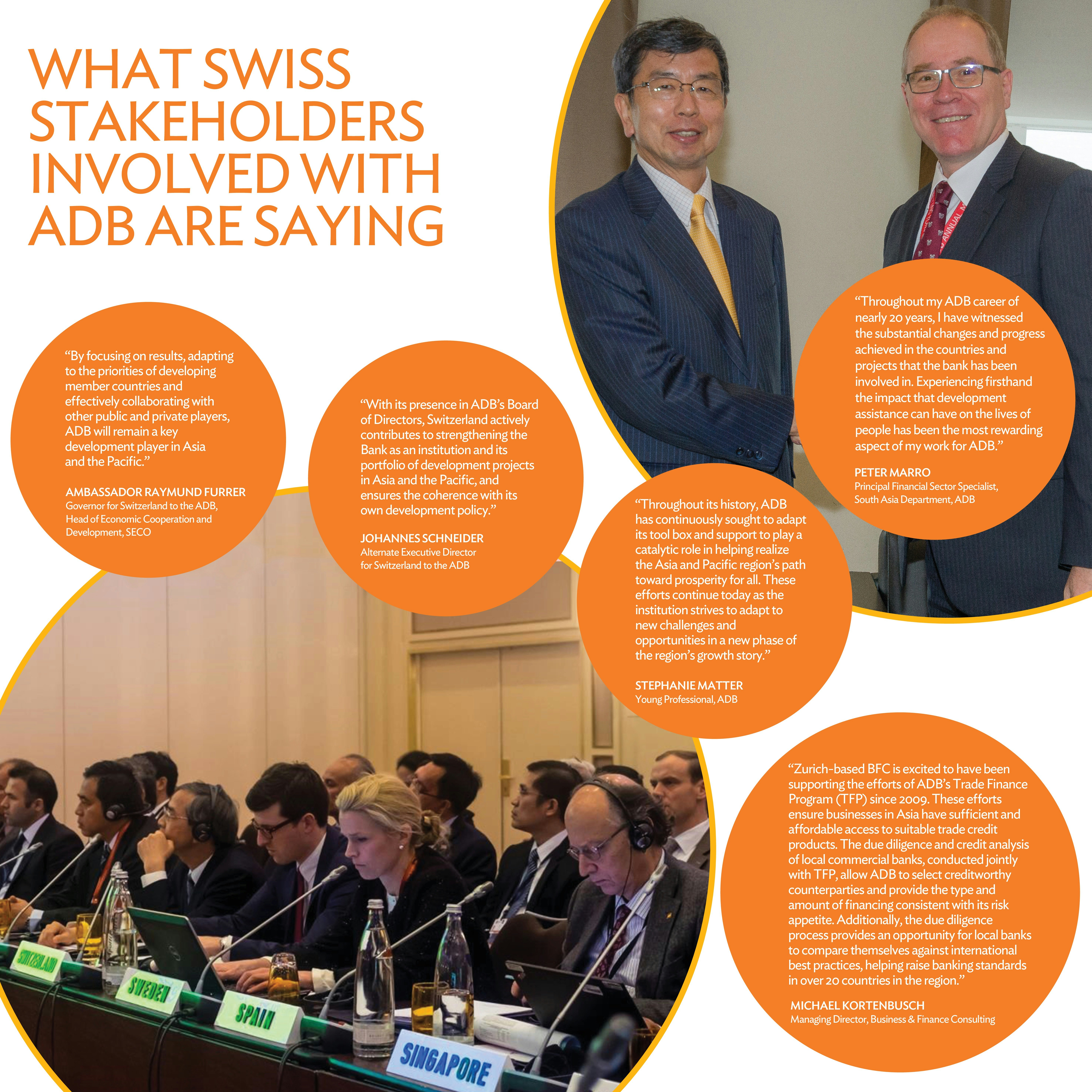 Le gouverneur suisse auprès de la BAsD, l'Ambassadeur Raymund Furrer, a souligné l’importance à divers égards de la Banque asiatique de développement: «La BAsD est une institution multilatérale cruciale qui assume une fonction de catalyseur dans la région Asie-Pacifique. La coopération suisse en Asie et avec la BAsD ne se limite pas au niveau gouvernemental: l'engagement du secteur privé suisse, des universités et des ONGs est tout aussi important pour le développement de l'Asie».